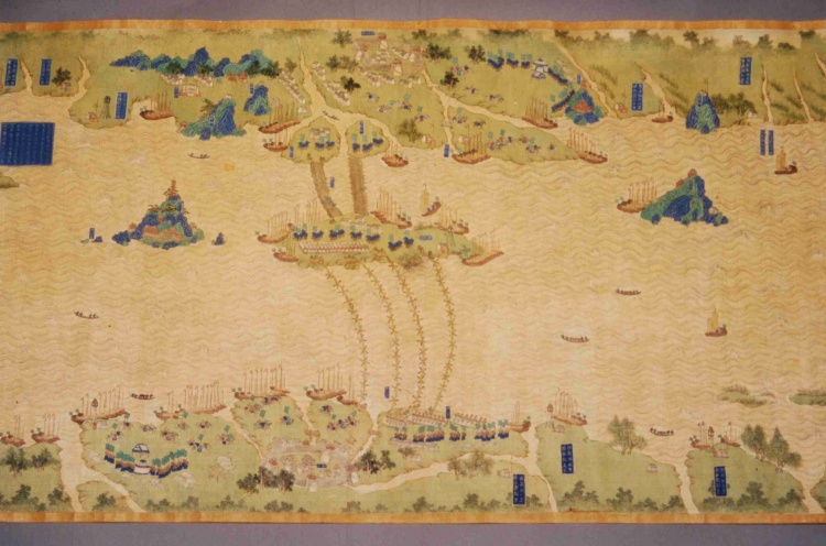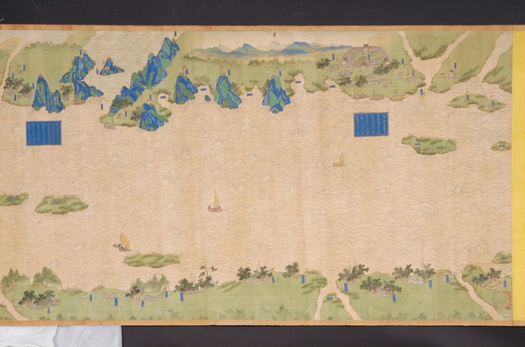 清代,縱59.7厘米,橫1340厘米。采用傳統(tǒng)技法繪制,上南下北,凡江水、港泊、洲渚、城池、村落、林木、山石、舟車、人物、旗幡、軍械均以立體形象呈現(xiàn),飾以石青、石綠等多種顏色。上起九江、下至鎮(zhèn)江,千里區(qū)域中列攔江纜、攔江牌、戰(zhàn)船、木樓、煙墩、駐軍地、營等各種軍事設(shè)施,每營均有金書大榜題,記述本營所處位置及兵力布置狀況,每汛的標(biāo)題上還記有汛與汛之間的里數(shù)。