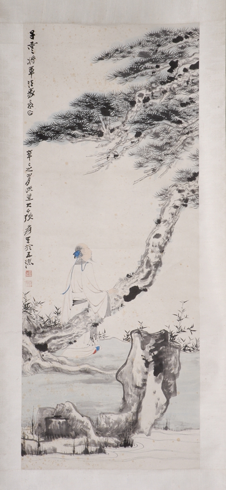 近現代,縱104.9厘米,橫41.6厘米,作者張大千。畫中高士倚坐山石,古松蒼勁,竹石清雅,筆墨兼工帶寫,意境空靈,盡顯文人超然之態(tài)。
