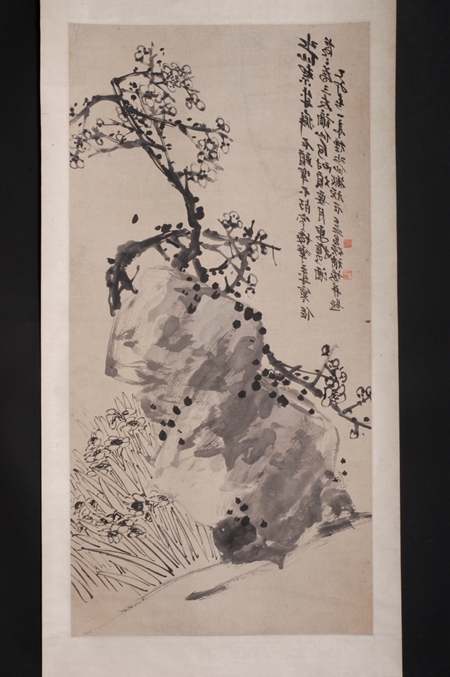 清代,水墨花鳥畫立軸,吳昌碩、王一亭合作,紙本??v128.5厘米,橫63.3厘米。款署“乙卯春一亭種水仙搬頑石,吳昌碩補梅并題”;鈐“缶翁”白文方印、“一亭父”朱文方印。構圖險奇,巨石斑駁渾厚,梅樹老干椏槎(chá),鐵骨錚錚,新枝旁出,穿插于其間,凌空屈曲,花開數(shù)朵,疏落有致,石旁水仙茂盛,纖塵不染。吳昌碩、王一亭合璧之作。