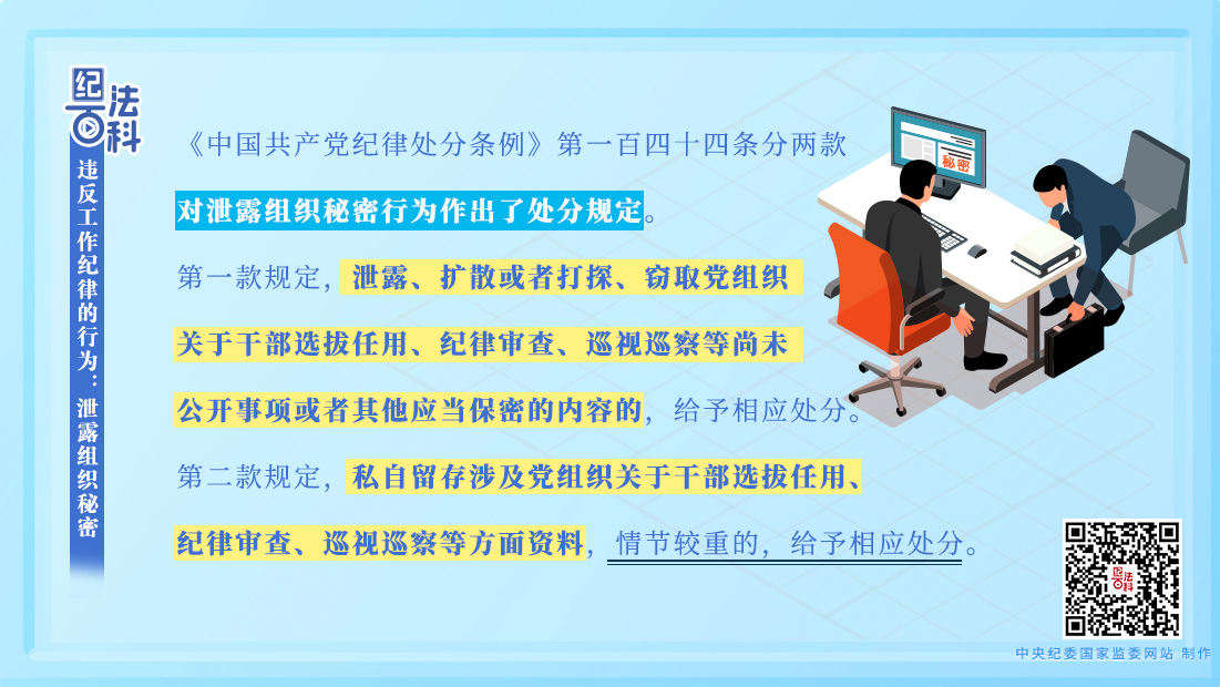 “嚴(yán)守黨的紀(jì)律,保守黨的秘密”,是每名黨員入黨宣誓時(shí)的鄭重承諾。無論選人用人工作、紀(jì)律審查工作,還是巡視巡察等工作,都有嚴(yán)格的保密紀(jì)律?!饵h政領(lǐng)導(dǎo)干部選拔任用工作條例》規(guī)定,選拔任用黨政領(lǐng)導(dǎo)干部,不準(zhǔn)私自泄露研判、動(dòng)議、民主推薦、民主測(cè)評(píng)、考察、醞釀、討論決定干部等有關(guān)情況?!吨袊?guó)共產(chǎn)黨紀(jì)律檢查機(jī)關(guān)監(jiān)督執(zhí)紀(jì)工作規(guī)則》規(guī)定,監(jiān)督執(zhí)紀(jì)人員不準(zhǔn)私自留存問題線索和涉案資料,嚴(yán)禁泄露審查調(diào)查工作情況,對(duì)紀(jì)檢干部私存線索、跑風(fēng)漏氣、違反安全保密規(guī)定等違紀(jì)行為要嚴(yán)肅處理。《中國(guó)共產(chǎn)黨巡視工作條例》規(guī)定,巡視工作人員私自留存巡視工作資料,泄露與巡視工作有關(guān)的未公開信息的,要給予處理處分。