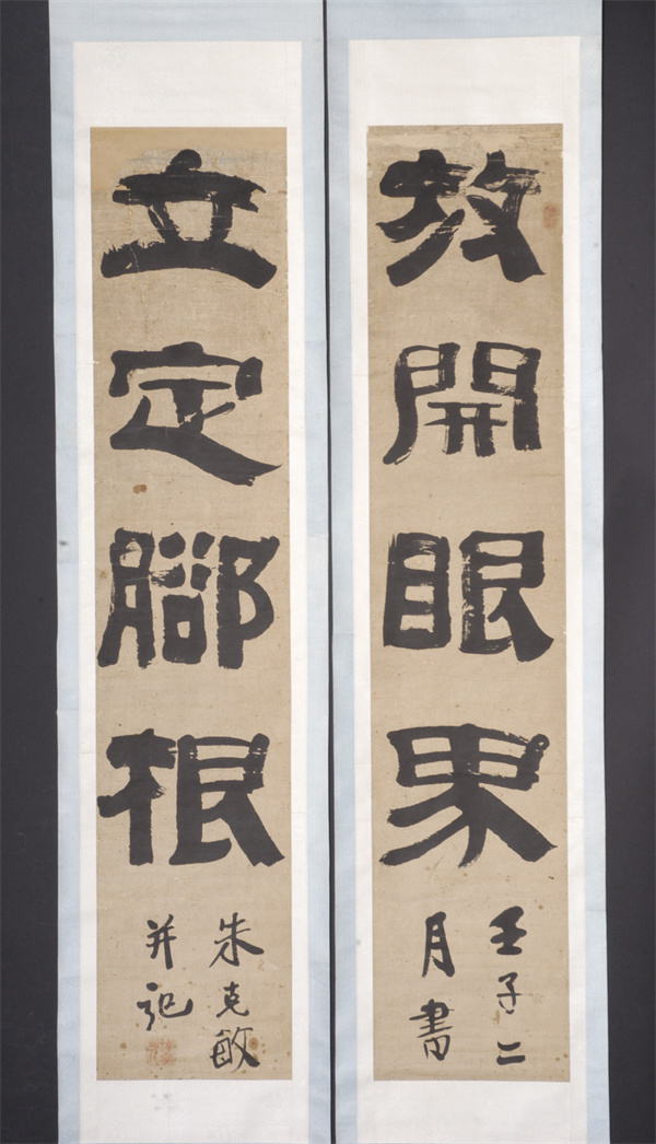 清代,縱130.3厘米,橫29厘米。此作筆力雄健沉厚,結(jié)體方正寬博,墨色濃重蒼勁,盡顯樸拙大氣。作者朱克敏,字時(shí)軒,號(hào)游華山人、鳳林山樵,甘肅皋蘭(今蘭州)人,清代中期隴上著名書(shū)畫(huà)家、詩(shī)人。