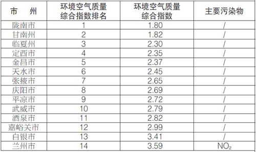 9月份,全省14個(gè)城市環(huán)境空氣質(zhì)量綜合排名由好到差分別為:隴南、甘南、臨夏、定西、金昌、天水、張掖、慶陽(yáng)、平?jīng)?、武威、酒泉、嘉峪關(guān)、白銀、蘭州。