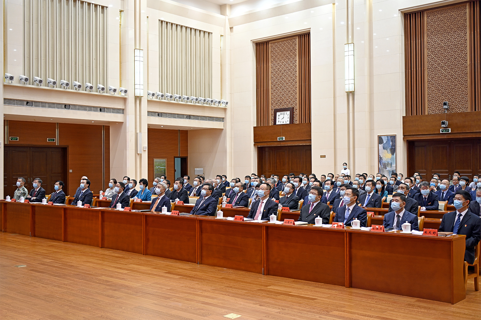 7時53分許,在歡快的樂曲聲中,習近平等黨和國家領(lǐng)導(dǎo)人來到天安門城樓主席臺,會場爆發(fā)出熱烈的掌聲。8時整,慶祝大會開始,中國人民解放軍聯(lián)合軍樂團奏響雄壯的《義勇軍進行曲》,尹弘、任振鶴等全體起立,隨北京現(xiàn)場一起高唱中華人民共和國國歌,目視大屏幕里鮮艷奪目的五星紅旗冉冉升起,在天安門廣場上空迎風飄揚。在熱烈的掌聲中,習近平總書記發(fā)表重要講話,大家認真聆聽、專心筆記,第一時間深刻學習領(lǐng)會,不時報以熱烈的掌聲。