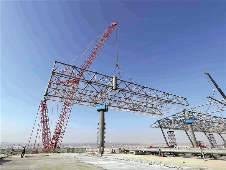 記者了解到,蘭州中川國(guó)際機(jī)場(chǎng)三期擴(kuò)建工程新建航站樓共有A、B、C、D四條指廊,是航站樓重要組成部分,每條指廊長(zhǎng)117米、寬90米,屋蓋投影面積20.45萬(wàn)平方米,建筑面積39.73萬(wàn)平方米。此次封頂?shù)臑楹秸緲荄指廊部分,由支撐體系和屋蓋鋼桁架結(jié)構(gòu)組成,形成了一個(gè)不規(guī)則的自由曲面空間,總投影面積達(dá)到了29500平方米,總重量達(dá)2800多噸。根據(jù)總體計(jì)劃,蘭州中川國(guó)際機(jī)場(chǎng)三期航站樓工程鋼結(jié)構(gòu)將于2022年底實(shí)現(xiàn)全面封頂。