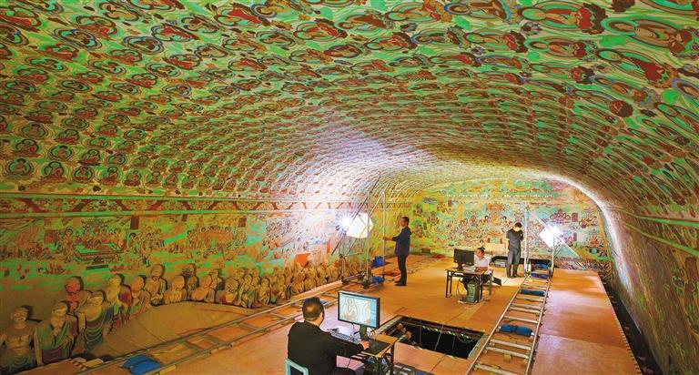 莫高窟第148窟數(shù)字化采集工作現(xiàn)場。敦煌研究院在國內(nèi)率先進行文物數(shù)字化的探索研究,形成了一套科學(xué)的壁畫彩塑數(shù)字化技術(shù),制定了14項文物數(shù)字化保護技術(shù)標(biāo)準與規(guī)范。