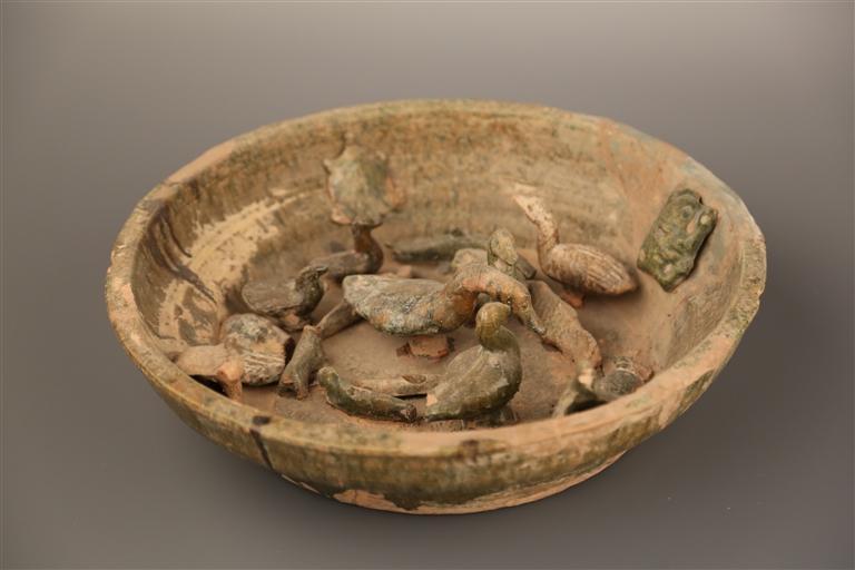 綠釉陶陂池高15厘米,口32厘米,底16厘米,為蘭州市博物館館藏三級文物。陶陂池內有形象生動的鴨、鵝、龜、青蛙等造型,代表墓主人生前擁有這樣一份家產(chǎn)。陂池,指在自然坡地筑堤蓄水澆灌農(nóng)田的池塘、澤沼。我國興修陂池的歷史很早,傳說夏禹治水時,曾從事“陂九澤”的工程。利用地勢蓄水灌溉,在古代較為普遍,尤其在漢代時陂池工程得到較大發(fā)展。陂池養(yǎng)魚、家禽、種藕、種菱角、養(yǎng)龜,不僅可提高農(nóng)民的經(jīng)濟收入,豐富人們的食物來源,還可以起到美化環(huán)境、凈化水質的作用,青蛙、田螺自由生存,起到平衡自然生態(tài)的作用。