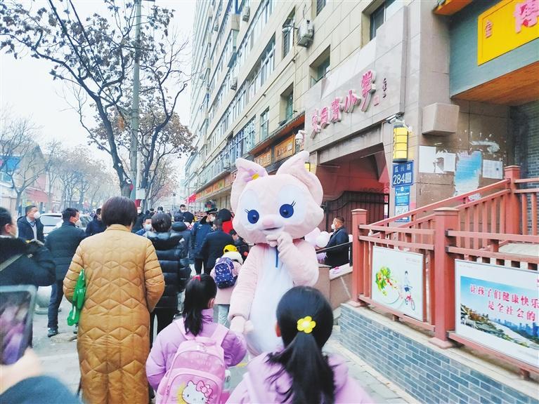 安西路小學(xué),萌寵玩偶迎接學(xué)生們。