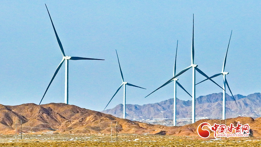 2月21日,張掖市臨澤縣平川北灘30萬千瓦風(fēng)電項(xiàng)目建設(shè)現(xiàn)場,已建成的風(fēng)電機(jī)組。