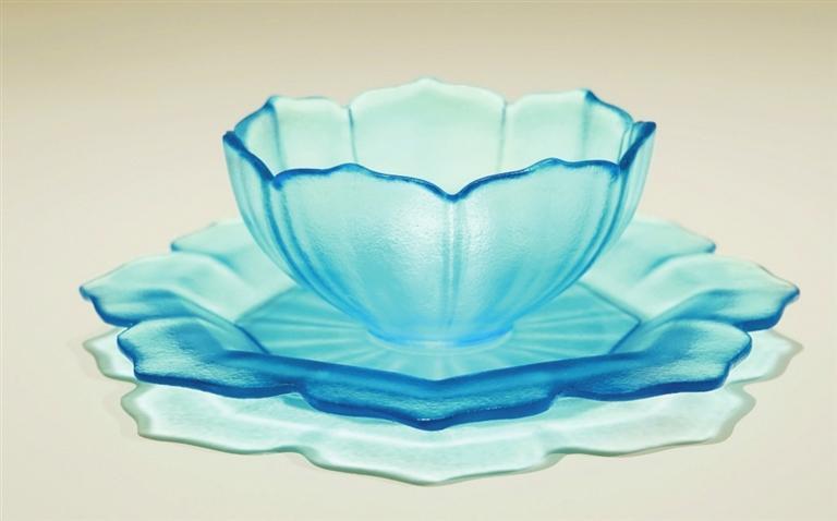 當然,它的不凡更來自于它的創(chuàng)意源頭——甘肅省博物館展廳里那只造型華美、完整成套、顏色高貴的蓮花形玻璃托盞。