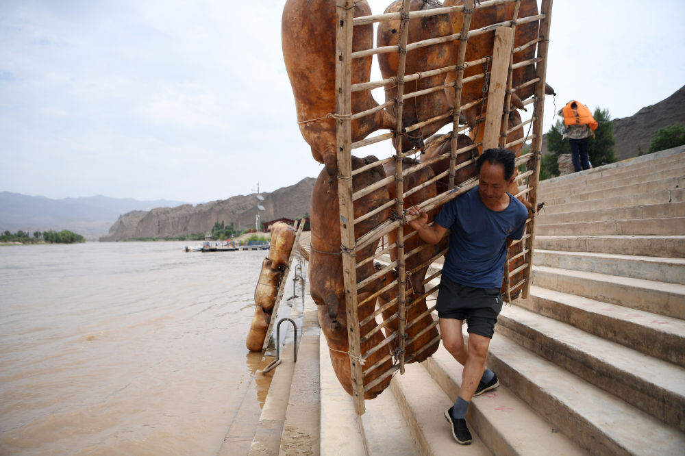 一名筏子客在黃河石林景區(qū)背著羊皮筏子準(zhǔn)備漂流(7月11日攝)。新華社記者 陳斌 攝