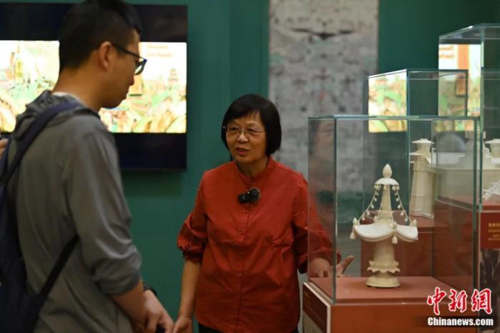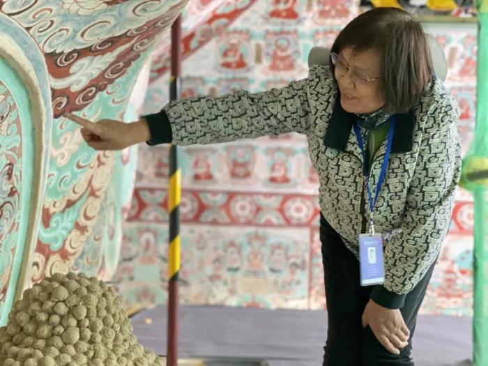 2023年7月14日,孫毅華向中新社記者介紹敦煌壁畫中的建筑形象。李亞龍 攝