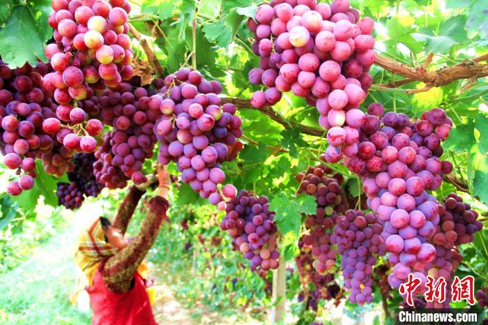 敦煌市莫高鎮(zhèn)農(nóng)民在采摘葡萄。(資料圖)張曉亮 攝
