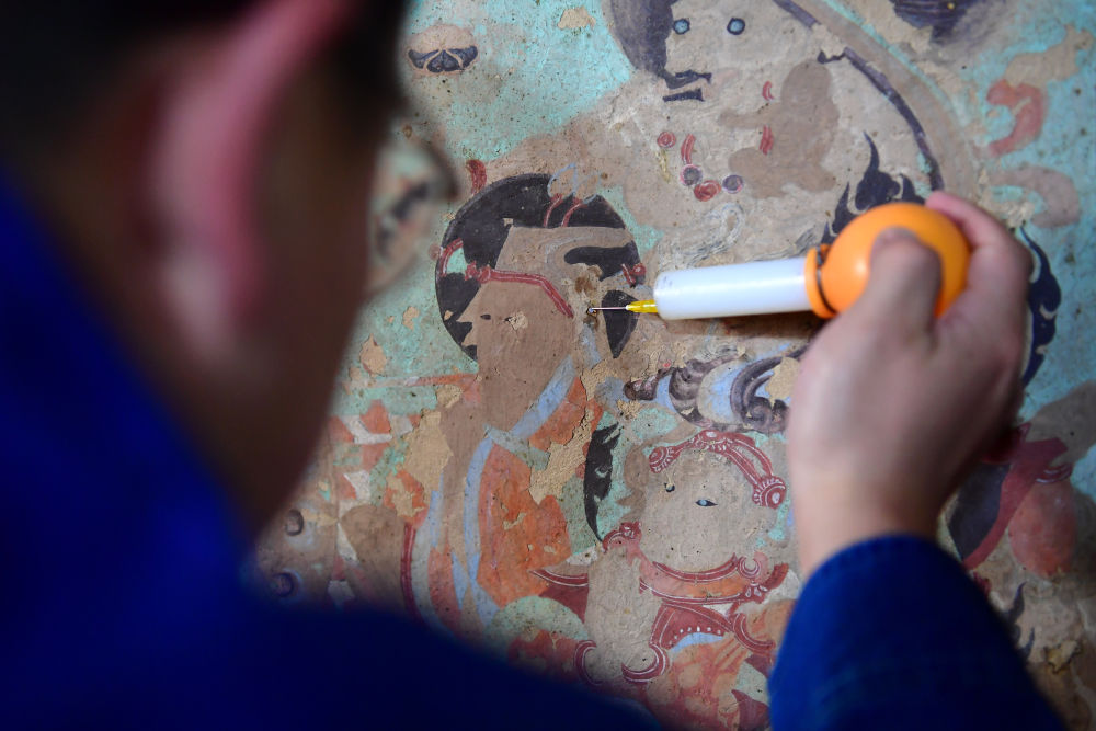 工作人員在修復出現病害的壁畫。記者 杜哲宇 攝