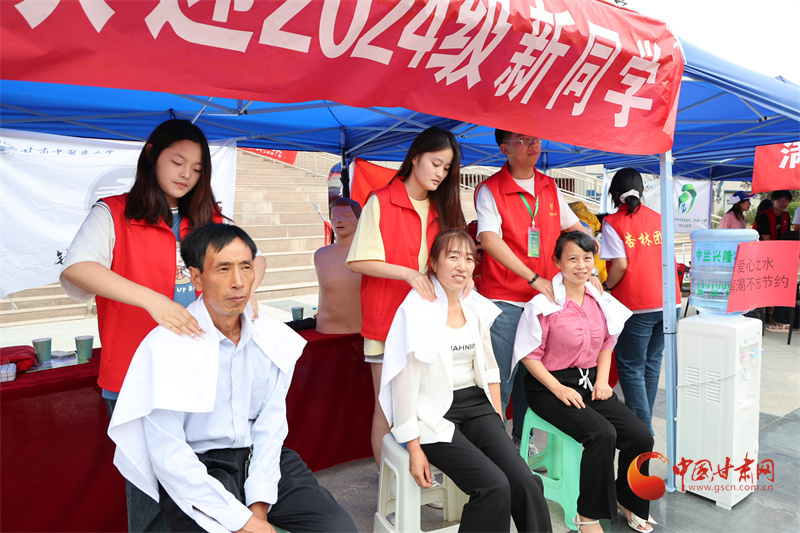 近水樓臺先得月,甘肅中醫(yī)藥大學(xué)校園社團依托中醫(yī)藥專業(yè)優(yōu)勢,在迎新點開設(shè)推拿按摩志愿服務(wù),以專業(yè)手法解決新生和家長的旅途疲勞。