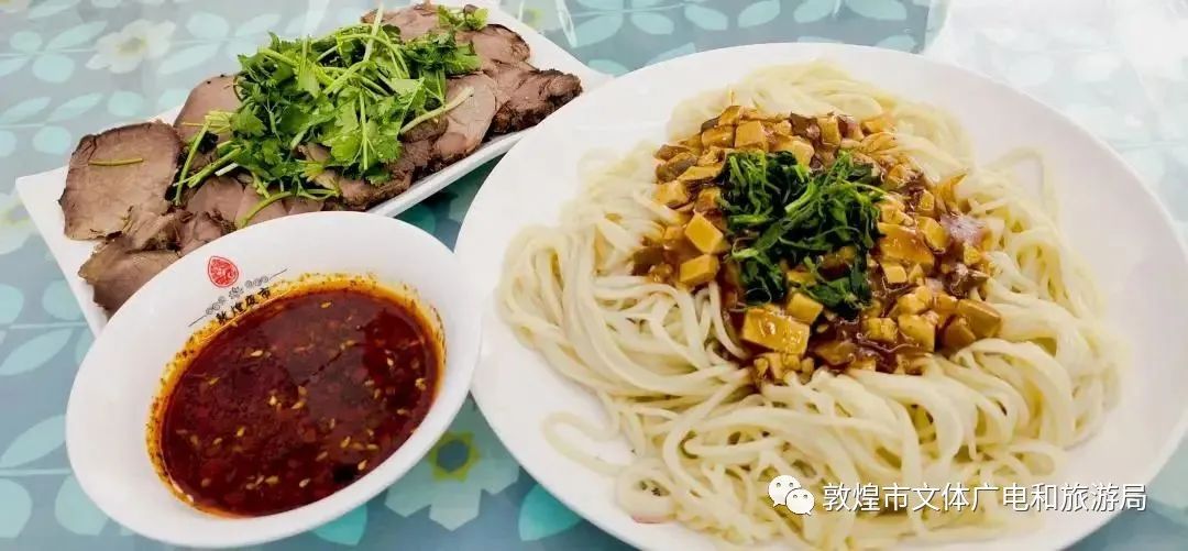 首選一定得是驢肉黃面,這是敦煌的一道傳統(tǒng)特色美食。