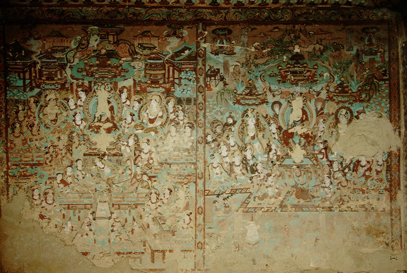 畫面中的人物造型嚴格遵循唐代仕女的畫風繪制,顯得豐腴飽滿,恰似盛唐時期雍容華貴的氣質寫照。線描寫實明快,流暢飛動,一氣呵成,仿佛是畫師用靈動的筆觸在墻壁上勾勒出的生命樂章。畫面的顏色以石綠、赭黃、鉛白為主色。整個畫面顯得典雅、嫵媚,令人賞心悅目。雖然伎樂天頭部原本貼金的頭飾已經(jīng)剝落,但歲月的痕跡并未減損她雍容華貴的氣質,反而更增添了一份歷史的厚重感。