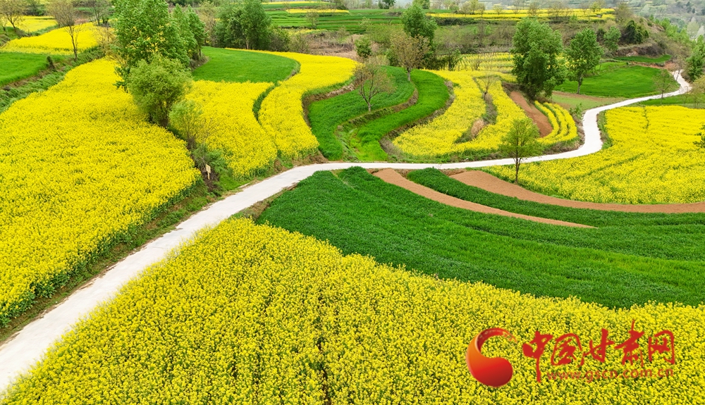 油菜花黃、麥苗青,鄉(xiāng)路蜿蜒,村落隱于花外,盡顯悠然鄉(xiāng)野意趣
