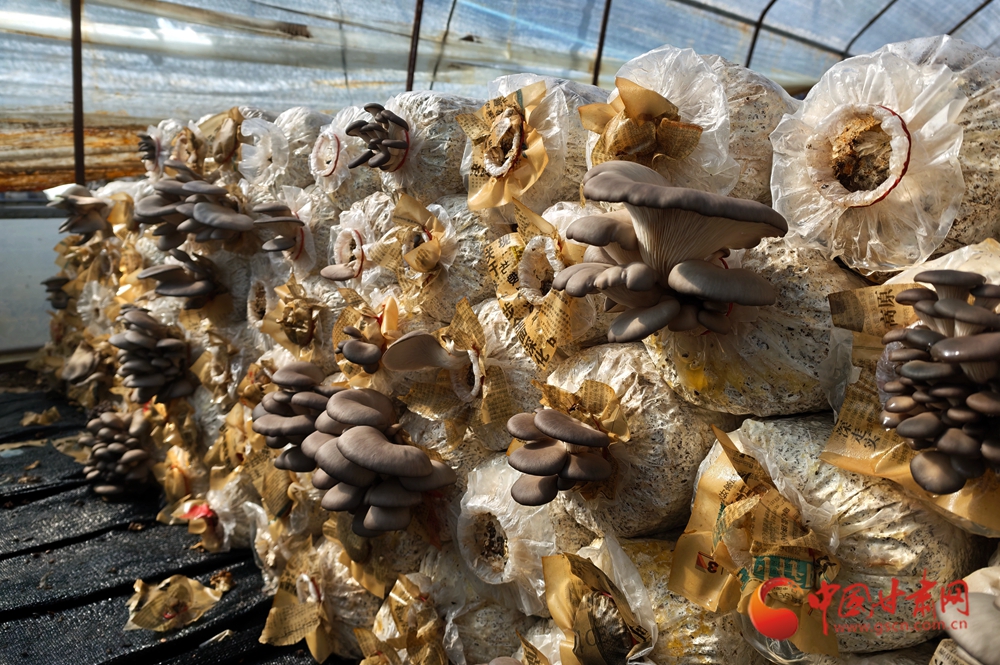 溫室大棚里,袋栽平菇簇擁生長,菌包整齊排列,菌蓋飽滿厚實,滿是豐收的生機