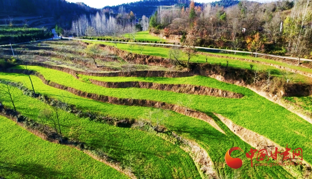 層疊梯田鋪展著鮮綠的麥苗,與山野林木相映,勾勒出春日里生機盎然的田園畫卷