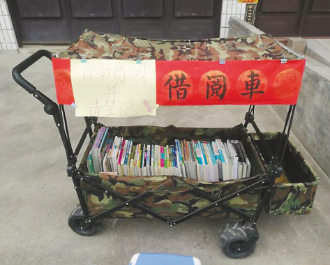 早上9點(diǎn)左右,自助借閱車從外婆家推出門,天黑了再推回來??吹较胱x的書,讀者自行登記書名和個(gè)人信息,留下聯(lián)系方式,就能把書借回家。