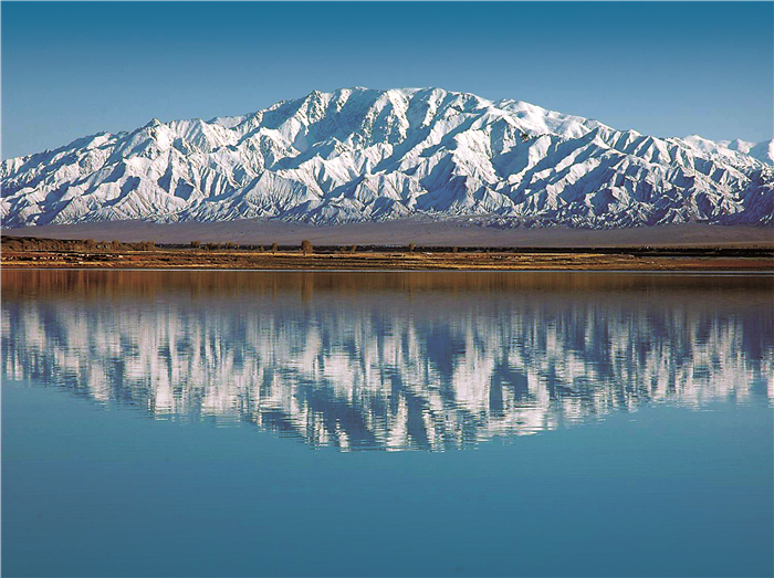 國道蜿蜒山寂靜,渾是冰雪嶺。疊嶂復(fù)層巒,瀚海藍天,雙塔妝湖鏡。
