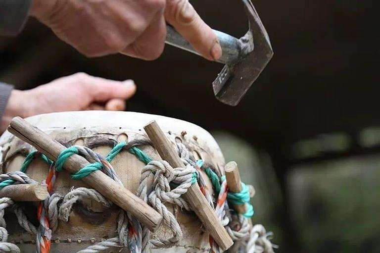 鼓做成后,放在陽(yáng)光下邊曬邊用重槌敲打,這叫“捶生牛皮”。鼓的聲音是捶打出來的。不捶打,鼓聲出不來,即使這面鼓干到成形了,也是一面啞鼓。鼓槌要用柳木做成,這種由軟木頭做的鼓槌較輕,能在鼓面上彈起來,用硬木頭做的鼓槌不但沒有這種性能,而且容易將鼓敲破。