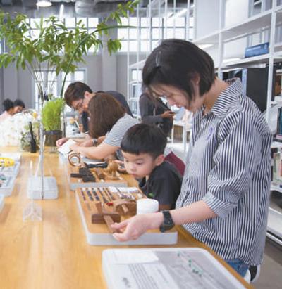在泰國(guó)創(chuàng)意與設(shè)計(jì)中心圖書館,來(lái)訪者正在位于二層的材料體驗(yàn)區(qū)參觀。泰國(guó)創(chuàng)意與設(shè)計(jì)中心圖書館供圖