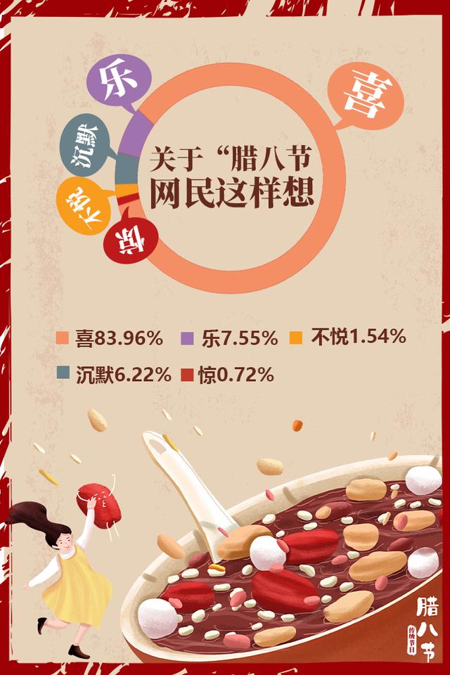 雖然今年多地的臘八節(jié)活動因疫情而取消,但是人們對于團圓、祥和、富裕、康寧、平安的期盼從未改變。有關“臘八”的網(wǎng)民情緒分布中,“喜”占83.96%,“樂”占7.55%??傮w來說,開心喜悅的情緒占到了九成以上。