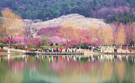 進(jìn)入景區(qū),走過一座石拱橋,眼前,一汪清水,綠意萌發(fā),乃傳說的“鹿女湖”。不時用手撩撥著拂面的楊柳,沿湖畔小徑繞行數(shù)百米,往上攀登,穿過一個山口,整個梅嶺景區(qū),便不驚不乍,呈現(xiàn)在眼前。霎時,我們被如此壯觀的山水梅林驚呆了。清凌凌的湖水邊、亭臺水榭間,依山而栽種的梅樹,紅的、白的、粉的、綠的梅花,競相綻放,層層疊疊、婆娑飛舞,爭芳斗艷、姹紫嫣紅,儼然一幅3D山水畫,仿佛置身“香國仙境”。
