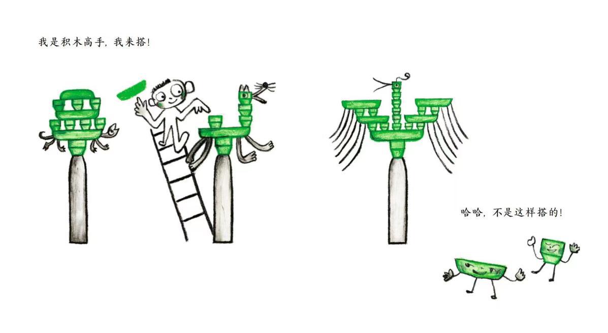 兒童蠟筆涂鴉式的拙趣畫風(fēng),配合生動鮮活、天真質(zhì)樸的畫面,處處透著童真,更加符合孩子的審美趣味。透過簡單童趣的意象,孩子可以展開更多天馬行空的想象,給創(chuàng)新創(chuàng)造能力插上自由的翅膀。