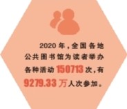 數(shù)據(jù)顯示,全國(guó)各級(jí)公共圖書館普遍開展講座、展覽、閱讀指導(dǎo)、讀書交流、演講誦讀等活動(dòng)。僅2020年,各地公共圖書館就為讀者舉辦各種活動(dòng)150713次,有9279.33萬(wàn)人次參加。