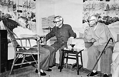 1982年7月7日下午,朱光潛(左)、茅以升(中)、宗白華三位老學(xué)者在朱光潛家會面談心 資料圖片