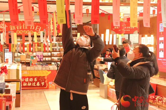 記者走進節(jié)日的新華書店,五顏六色的元宵燈謎和大紅燈籠交相輝映,營造出喜氣洋洋的節(jié)日氛圍。