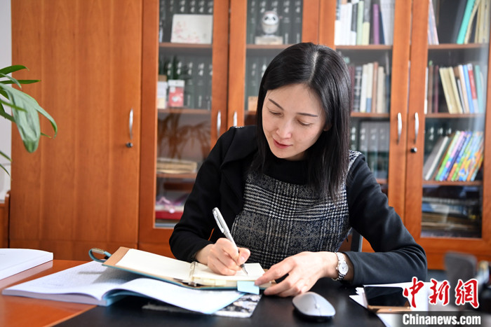 圖為2月20日,陳天竺向中新社記者介紹讀者出版集團(tuán)推出的“太空閱讀者”手辦。 中新社記者 九美旦增 攝