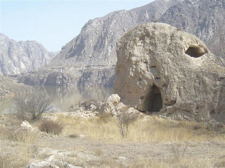東坪向東300米,就是榆中境內(nèi)唯一遺留的一處漢長(zhǎng)城遺址,該遺址現(xiàn)只有一處墻墩,緊鄰黃河,圍長(zhǎng)40 余米,高約5米,無任何防護(hù)措施,墻壁上,有磚、石混雜其中,人工夯筑之痕清晰可辨。西側(cè)墻面上,還有人掏挖的小窯洞。高1.3米,深達(dá)50厘米。破壞嚴(yán)重。漢長(zhǎng)城遺址再向東200米,東金公路向右拐入七峴溝,向來紫堡川而去,而黃河則被東面的大山阻擋,無路可去,左拐北折而流向什川。此處就是著名的黃河大“幾”字灣的第一灣。第一灣的南岸,有十來戶人家,地名叫駱圈灣。由于地處古絲綢之路,曾建有駱駝圈和小型客棧供駱駝客隊(duì)歇腳而又在黃河拐彎處而得名,后來,因諧音,叫羅泉灣。山腳下,有七八棵楊柳已吐綠。沿黃河,已無路可尋,就沿洪水沖的山溝上東山,還是無路,甚至沒有羊腸小道,巖石裸露,怪石嶙峋,坡陡難行。巖石層只有七八十米厚。此山的石頭,含有石英成分,石質(zhì)軟,無開采利用價(jià)值。再往上,就是黃土層,直到山頂。由于干旱,整個(gè)山上,無一棵樹木,甚至連灌木都沒有。耐堿耐旱的駱駝蓬只發(fā)出二厘米的枝蔓,一些蒿草和矮草,也剛發(fā)芽,還有一些匍匐在地面的無名小草,卻已開出了扁豆大小的艷麗的小花,有白色的和淡藍(lán)色的蝴蝶飛起飛落。爬到半山腰,太陽(yáng)已全面照曬,山坡雖陡峭,卻無陰涼可乘。渾身發(fā)熱,不得不解開衣扣,緩慢前行。