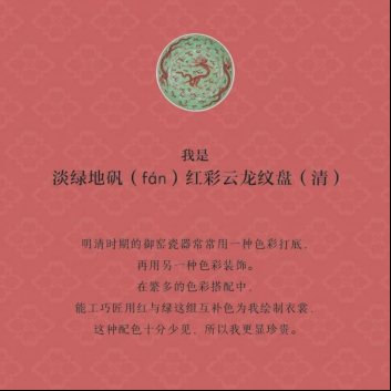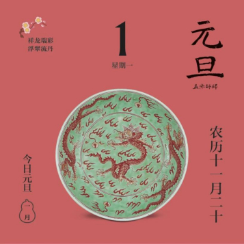 翻開(kāi)新年伊始的“元旦”頁(yè),映入眼簾的是一個(gè)綠色的盤(pán)子,上面有三條雄勁矯健的“龍爺爺”,它們來(lái)自清代吧!如意輕輕撕下日歷頁(yè)翻到反面,讀起文物小故事:“我是淡綠地礬(fán)紅彩云龍紋盤(pán)……”