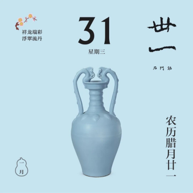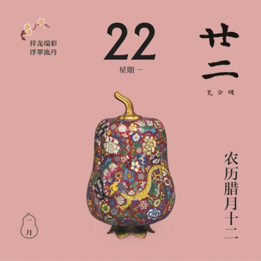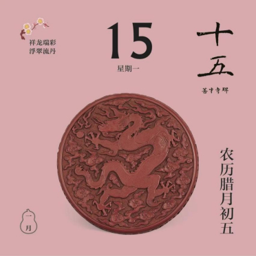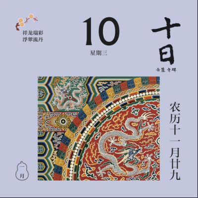 翻開(kāi)1月月份頁(yè),首先跳入眼簾的,是主題詞“祥龍瑞彩”。這個(gè)月以絢麗的顏色為主線(xiàn),串起各色龍文物,比如精致的宋代單色釉龍紋盤(pán),絢麗的故宮官式建筑和璽彩畫(huà),還有優(yōu)雅的清代掐絲琺瑯游龍花卉紋瓜式蓋罐……