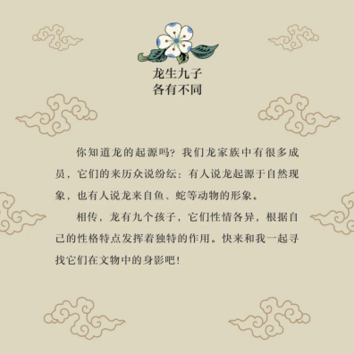 從2月到12月,如意更發(fā)現(xiàn)了“龍生九子”的故事,原來(lái),在鐘鈕上的龍子叫“蒲牢”,在宮門(mén)上的龍子叫“椒圖”……在古老的龍家族中,有把身子彎成S形的螭龍,有在空中振翅飛舞的應(yīng)龍,還有拱起身子趴在壺上的蟠龍……精選的故宮官式建筑上的和璽彩畫(huà)、大氣精美的九龍壁和千龍吐水的螭首奇觀,都讓如意著迷而向往。