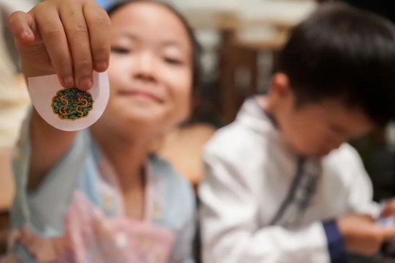 每個(gè)龍文物故事上方,也印有當(dāng)天文物的小圖,它周?chē)橛幸蝗Π雸A打孔的攏線(xiàn)。如意用小手沿著攏線(xiàn)輕輕一摳,一片小小的“龍鱗”就落在了手心。原來(lái),它就是今天的“成長(zhǎng)值”啊。
