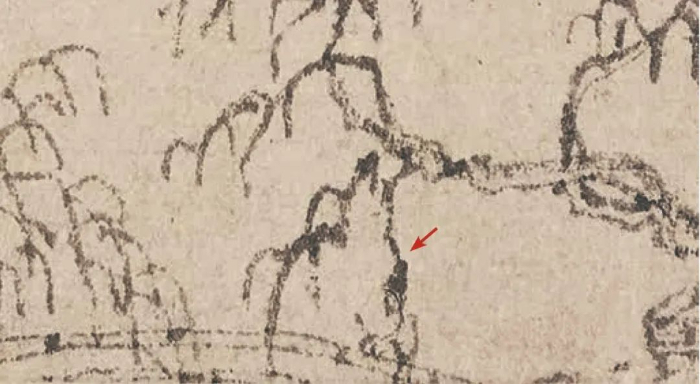 《富春山居圖》全卷共畫有六座橋,其中《剩山圖》上有兩座橋,《無用師卷》上有四座橋。讓我們先找到其中的一座橋,它在梁詩正書寫的“鑒定”開頭部分正下方。你有沒有發(fā)覺,這座橋最為特殊。
