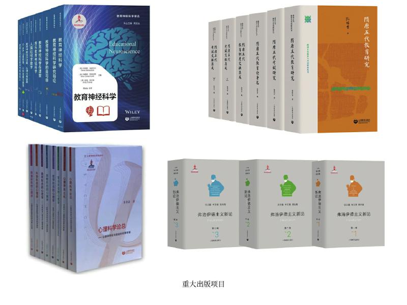 上教社密切關(guān)注新時代教育發(fā)展的重大理論問題與現(xiàn)實問題,響應(yīng)國家教育發(fā)展戰(zhàn)略需求,精心布局學術(shù)專業(yè)出版“大項目”,連續(xù)入選國家重點出版物出版規(guī)劃、2013—2025年國家辭書編纂出版規(guī)劃,獲國家出版基金資助。這其中除前文中的大型??乒ぞ邥€包括一系列教育與心理學原創(chuàng)研究和前沿研究成果:由中國教育史學者孫培青編著的“隋唐五代教育與考試研究叢書”,構(gòu)建了反映隋唐五代教育與考試全貌的教育理論體系和文獻資料體系,是中國教育史學科建設(shè)的一項學術(shù)文化積累工程;《中國課程史》以現(xiàn)代課程理論為分析框架,以歷史線索展現(xiàn)中國學校課程的新陳代謝;“教育神經(jīng)科學譯叢”(9冊)是我國首個聚焦教育神經(jīng)科學這一國際教育研究前沿領(lǐng)域的學術(shù)譯介系列;《中國傳統(tǒng)德育心理學思想新論》系統(tǒng)挖掘整理中華優(yōu)秀傳統(tǒng)文化中蘊含的德育心理學思想,構(gòu)建中國特色心理學話語體系;我國第一套以大心理學觀,從本土心理學視角系統(tǒng)探索和解讀不同形態(tài)心理學的學術(shù)系列“心理學形態(tài)研究系列”(6冊),全景考察心理學的命運與前途,深入探索中國本土心理學的選擇與突破;《弗洛伊德主義新論》(三卷)匯聚國內(nèi)弗洛伊德主義研究領(lǐng)域的權(quán)威學者,歷史展現(xiàn)弗洛伊德理論的百年發(fā)展歷程,提供弗洛伊德主義研究的“全景圖”。這些重大出版項目為構(gòu)建中國特色自主知識體系,建設(shè)中國教育學和心理學學科體系、學術(shù)體系、話語體系發(fā)揮了重要作用。