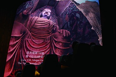 數(shù)字電影為游客欣賞敦煌藝術(shù)提供了全新的視覺(jué)體驗(yàn)。圖為7月26日,游客在敦煌莫高窟數(shù)字展示中心欣賞球幕電影《夢(mèng)幻佛宮》。