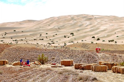 近年來(lái),莫高窟已經(jīng)逐漸形成風(fēng)沙危害綜合防護(hù)體系,有效減輕了風(fēng)沙對(duì)石窟的影響。圖為7月23日,在莫高窟的崖頂上,工作人員正在鋪設(shè)草方格固沙。