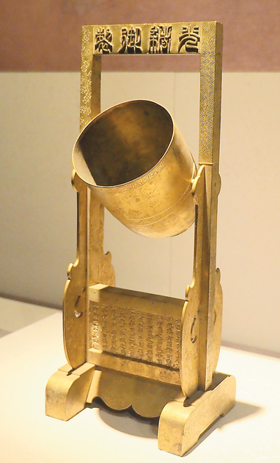 一件造型獨(dú)特的金色器物吸引了記者注意。達(dá)微佳介紹,這是故宮博物院藏清代銅鍍金欹器。欹器是一種傾斜易覆的盛水器,中空時(shí),會(huì)向一側(cè)傾斜;注水一半時(shí),能保持端正;水注滿時(shí),會(huì)傾覆倒出,生動(dòng)展現(xiàn)了儒家“不偏不倚,無過不及”的中庸之道。據(jù)文獻(xiàn)記載,孔子曾在魯桓公之廟觀欹器,并向?qū)W生講解它的道理。古時(shí)國(guó)君將欹器置于座右,作為修身之戒,因此又稱“宥坐之器”。