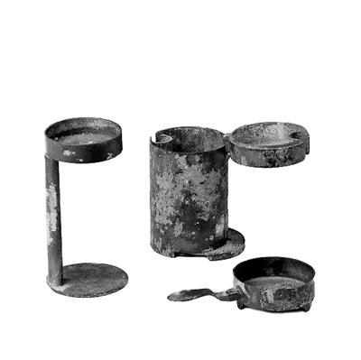 這件青銅鑄造的鼎形燈,收合時為附耳三足蓋鼎,內(nèi)盛燃燈時所用的油料,以子母口扣合。蓋中央為一突起的圓柱狀銎,蓋兩側(cè)為相對的二鴨首,其寬嘴正好銜住雙鍵,鼎蓋便被牢牢扣住。用燈時,將雙鍵支起,可插入鼎蓋中心的圓銎中,鼎蓋即成為燈盞。鼎形燈構(gòu)造精巧,設(shè)計科學(xué),使用方便,封口嚴(yán)密不溢油,為貴族出行時使用的燈。