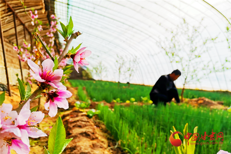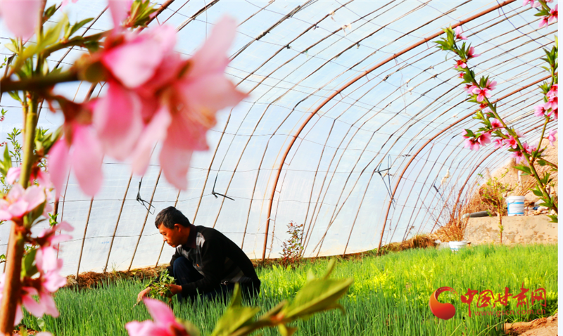 走進敦煌市月牙泉鎮(zhèn)現(xiàn)代采摘園區(qū)農民陶寶憲的溫室大棚,粉紅的桃花開得正艷,濃濃春意撲面而來,在花香的陪伴下,陶寶憲在大棚中辛勤勞作。