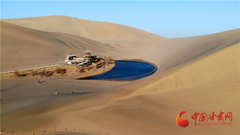 這是3月17日拍攝的甘肅省敦煌市鳴沙山月牙泉景區(qū)(無人機照片)。