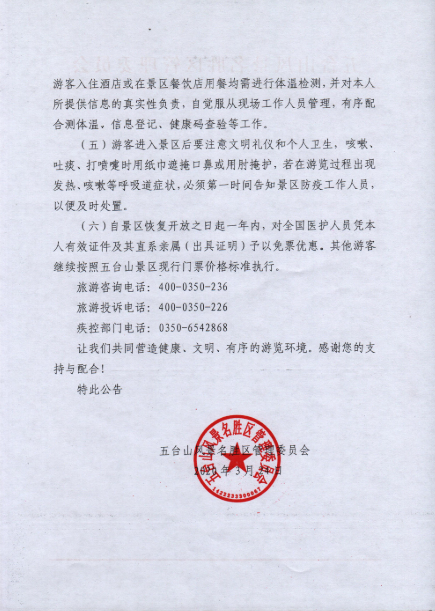 五臺(tái)山風(fēng)景名勝區(qū)強(qiáng)調(diào),恢復(fù)開放期間,五臺(tái)山將對(duì)景區(qū)人員密度進(jìn)行實(shí)時(shí)監(jiān)控。五臺(tái)山風(fēng)景名勝區(qū)管理委員會(huì)還宣布,自景區(qū)恢復(fù)開放之日起一年內(nèi),對(duì)全國醫(yī)護(hù)人員憑本人有效證件及其直系親屬(出具證明)予以免票優(yōu)惠。