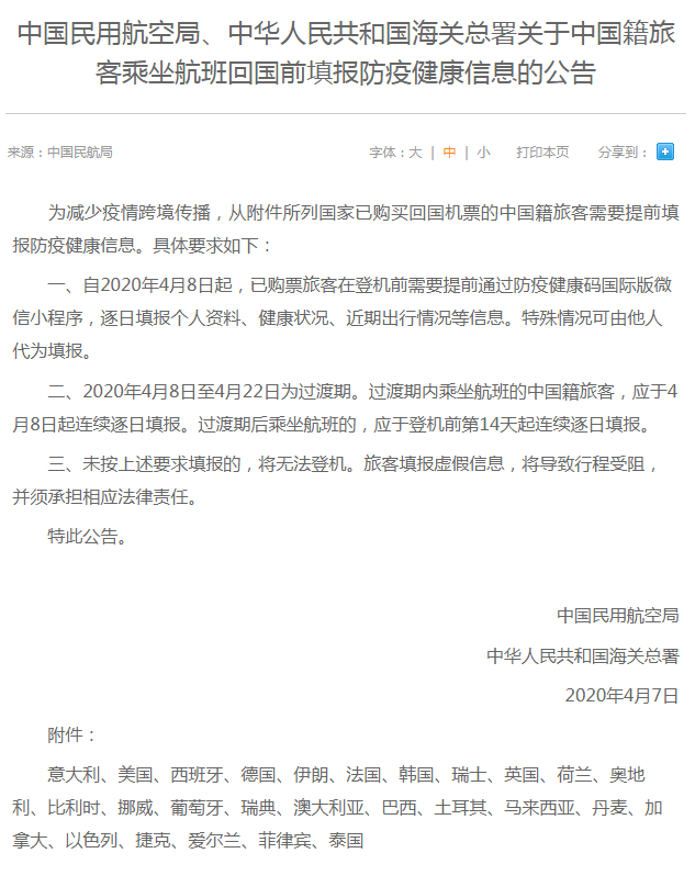 中國(guó)民用航空局、中華人民共和國(guó)海關(guān)總署4月7日聯(lián)合發(fā)布《關(guān)于中國(guó)籍旅客乘坐航班回國(guó)前填報(bào)防疫健康信息的公告》(以下簡(jiǎn)稱《公告》)?!豆妗分赋?,自4月8日起,從意大利、美國(guó)、西班牙等26個(gè)國(guó)家已購(gòu)買回國(guó)機(jī)票的中國(guó)籍旅客需要在登機(jī)前提前填報(bào)防疫健康信息,包括逐日填報(bào)個(gè)人資料、健康狀況、近期出行情況等。旅客未按要求填報(bào)的,將無(wú)法登機(jī);填報(bào)虛假信息,將導(dǎo)致行程受阻,并須承擔(dān)相應(yīng)法律責(zé)任。