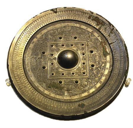 漢代設(shè)專門的機構(gòu)和官職管理銅鏡制作,有記載:“少府之下有尚方令一人,御用及官制銅鏡均由尚方制作”。所謂“規(guī)矩紋”是一種類似英文字母“T”“V”“L”的符號組成,這三種符號裝飾規(guī)整,稱之為“規(guī)矩紋”。在銅鏡之上一般還有瑞獸圖案,起到了祈福保佑的作用。
